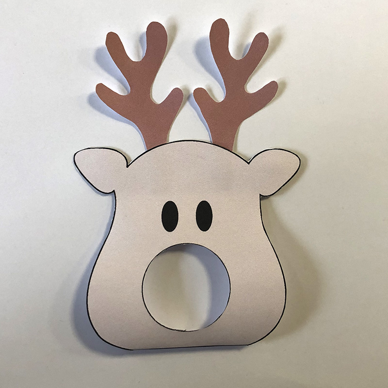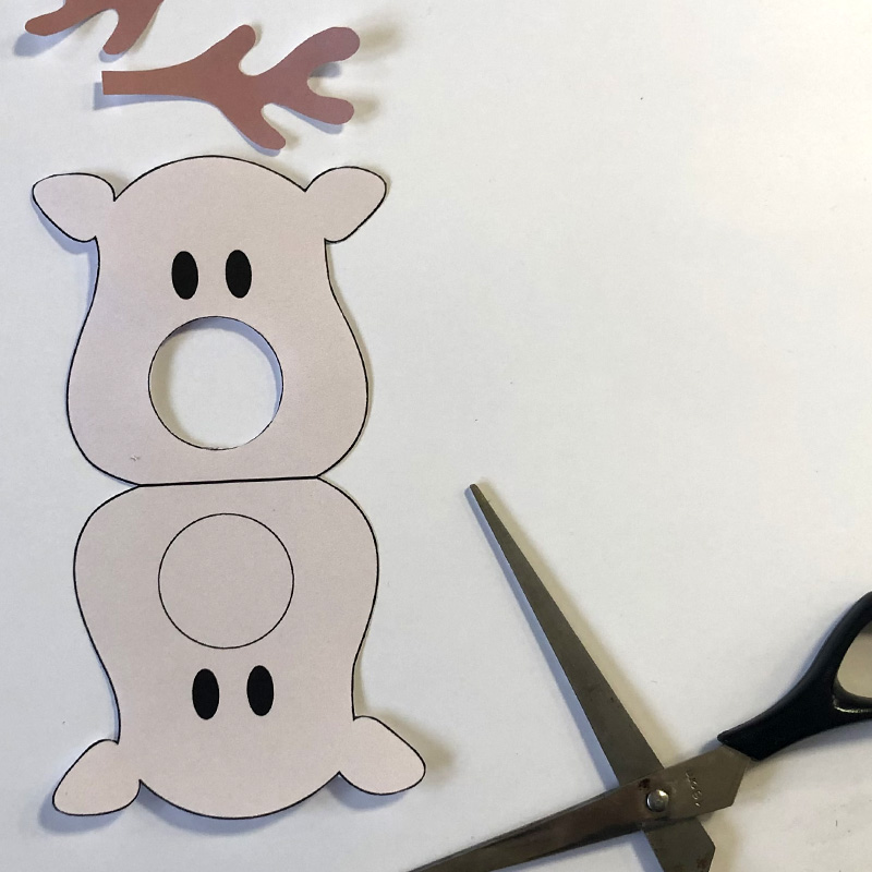 1. Drucke dir die Vorlage wenn möglich auf festeres Papier und schneide die Köpfe und Geweihe sorgfältig aus. Auch die Nase muss ausgeschnitten werden.