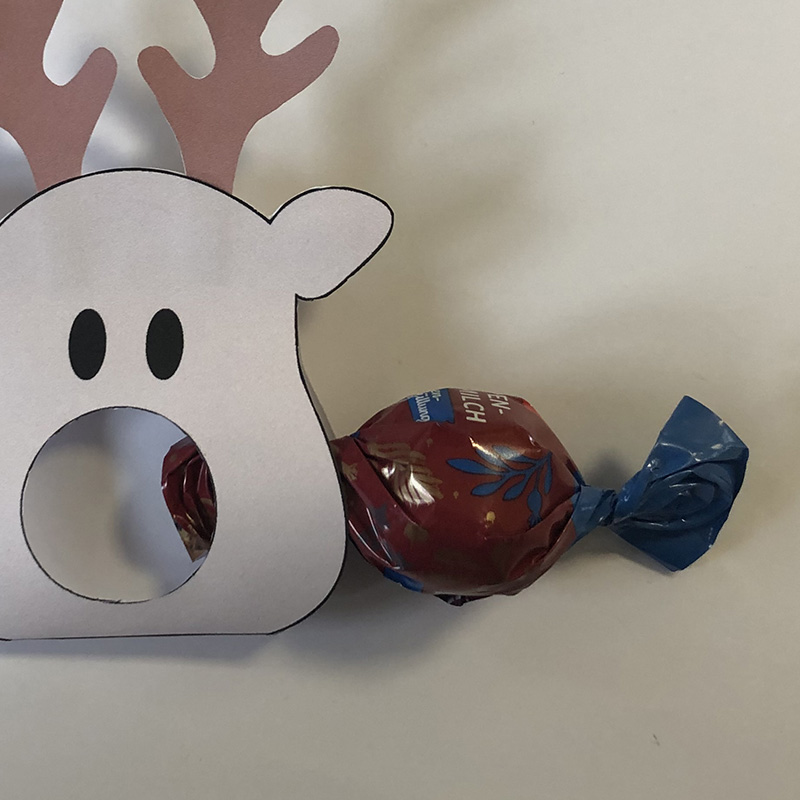 Mit Papier, Schere und Kleber entsteht im Handumdrehen ein kleines Rentier. Das Besondere daran: Eine Schokoladenkugel wird mit eingebaut und macht die Bastelidee nicht nur dekorativ, sondern auch richtig lecker. Perfekt als kleines Geschenk oder für eine kreative Bastelpause.