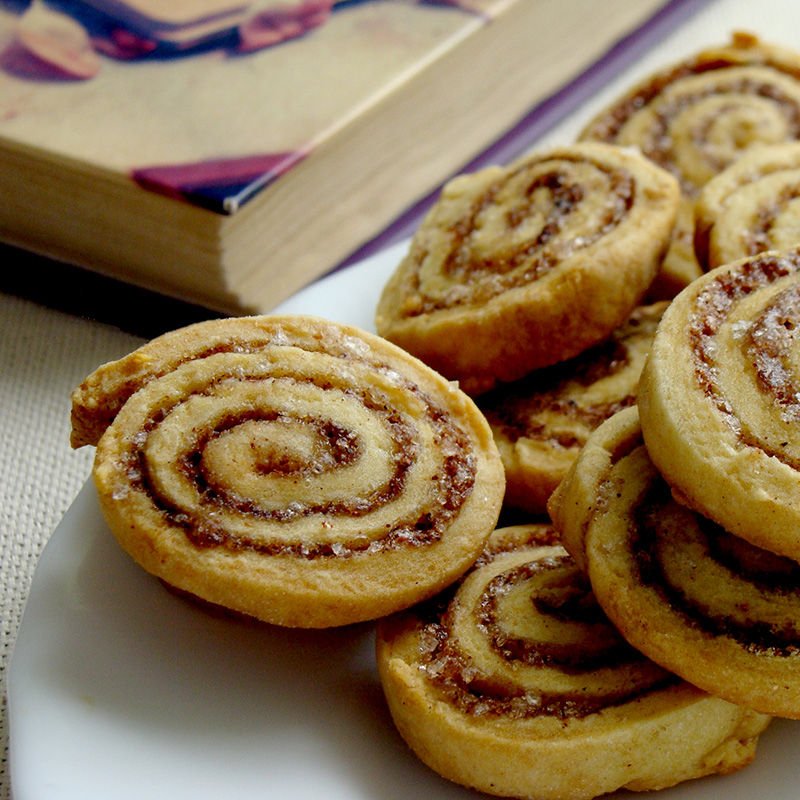 Den Teig zwischen zwei Lagen Frischhaltefolie zu einem Rechteck von etwa 20 × 30 cm ausrollen. Danach die obere Folie entfernen. Den Teig mit flüssiger Butter bestreichen, den restlichen Zucker mit dem Zimt in einer kleinen Schüssel vermengen und großzügig über den Teig streuen. Etwa 1 EL der Zimtzuckermischung auf einem großen Teller beiseitestellen.