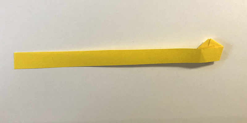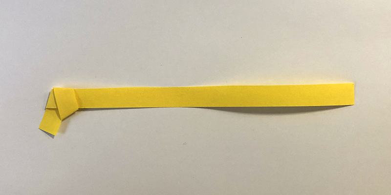 1. Lege das eine Ende des Papierstreifens wie zu einem Knoten zusammen, sodass ein regelmäßiges Fünfeck entsteht. Ziehe das Ende vorsichtig fest, damit das Fünfeck stabil ist. Das kleine Ende kannst du einfach einklappen.