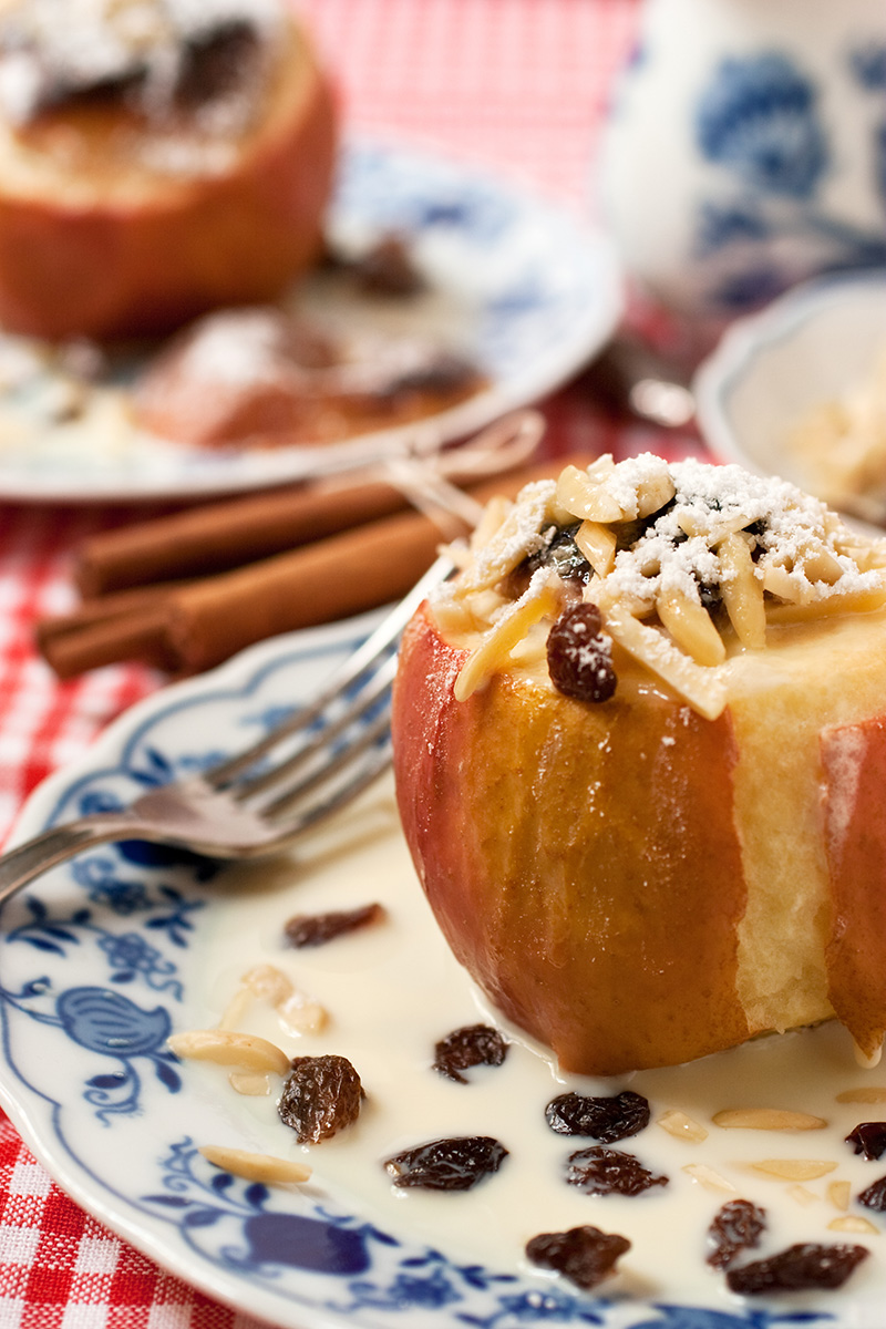 Die Äpfel gründlich waschen und das Kerngehäuse entfernen. Mandeln, Rosinen, Konfitüre und Zimt miteinander vermengen, die Mischung mit einem Teelöffel in die entstandene Öffnung der Äpfel füllen und mithilfe eines Kochlöffelstiels leicht nach unten drücken. Anschließend die Äpfel in eine gefettete Auflaufform setzen und auf jeden Apfel ein kleines Stück Margarine legen.